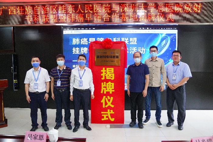 2022年5月23日,广西壮族自治区桂东人民医院与深圳大学总医院举行放射专科联盟暨肺癌早筛合作基地揭牌仪式。深圳大学总医院放射科主任、博士生导师吴光耀教授,放射科副主任吴若岱教授,广西壮族自治区桂东人民医院院长吴家恩,副院长李柏均出席并为基地揭牌。