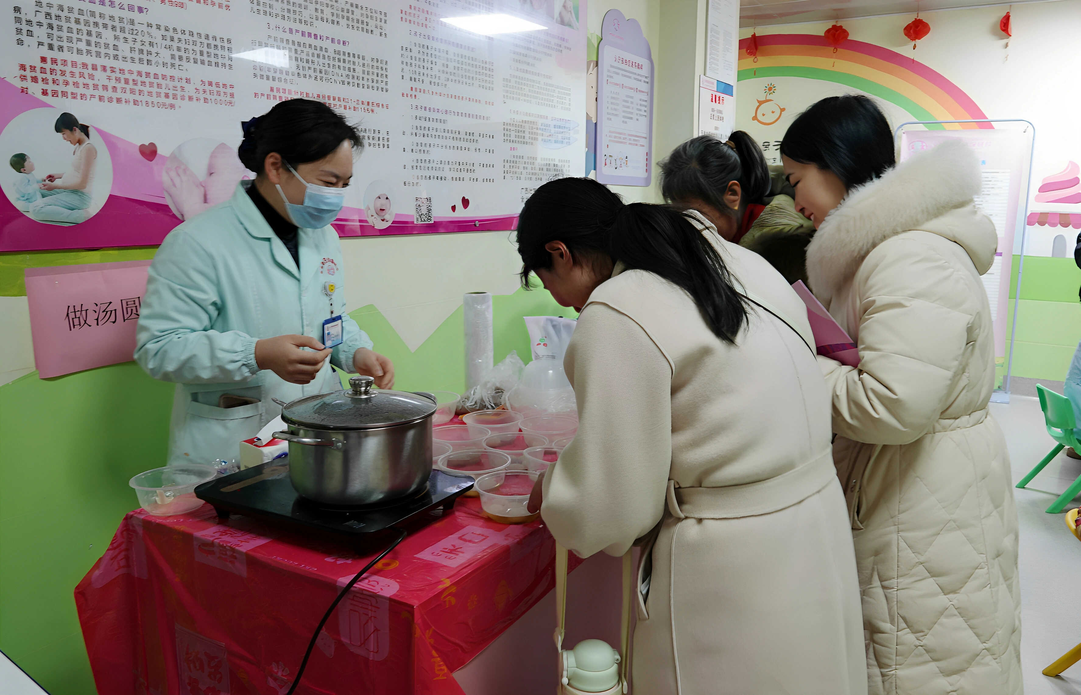在手工区,家长和孩子们共同制作元宵花灯,体验剪纸。儿童保健科的医护人员化身“手工导师”,指导家长跟小朋友一起做灯笼,孩子们专注地跟着指导老师的步骤,使用安全剪刀小心翼翼地剪裁,家长们在一旁耐心协助,充满童趣和创意的花灯、剪纸作品深受孩子们喜爱。大家还围坐在一起分享汤圆,孩子们品尝着香甜的汤圆,家长们则交流育儿心得。儿童保健科的医护人员为孩子们讲解了元宵节的由来和习俗,让美味与文化知识一同滋养孩子们的心灵。
