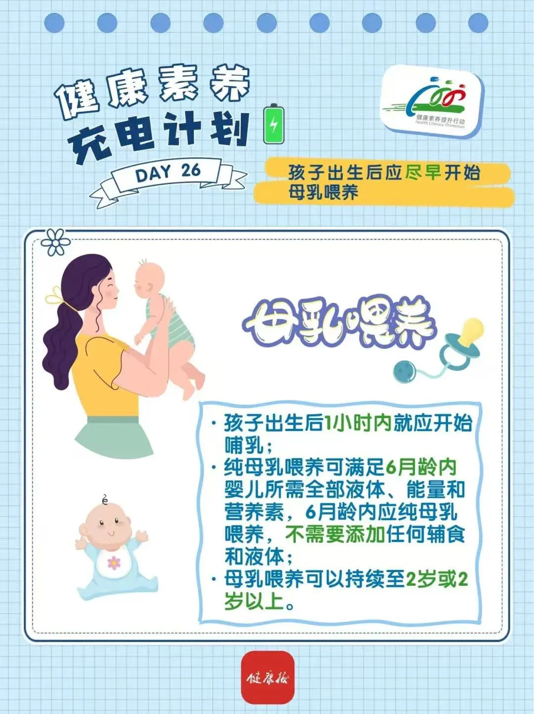 为倡导文明健康生活方式,提升居民健康素养水平,“健康八桂”微信公众号聚焦《中国公民健康素养——基本知识与技能(2024年版)》(简称“健康素养66条”)开展健康知识普及。本期内容为:孩子出生后如何正确喂养?