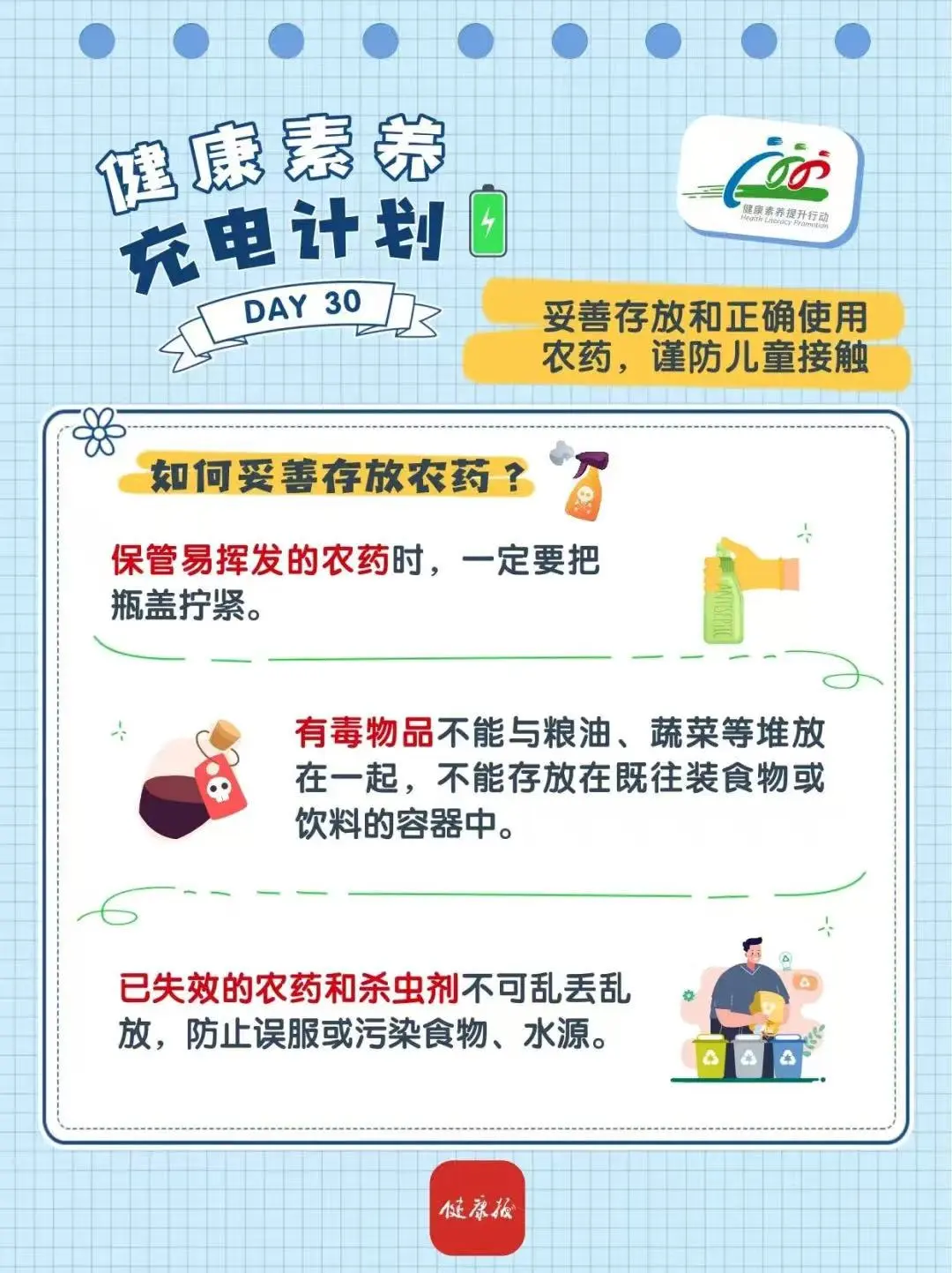 为倡导文明健康生活方式,提升居民健康素养水平,“健康八桂”微信公众号聚焦《中国公民健康素养——基本知识与技能(2024年版)》(简称“健康素养66条”)开展健康知识普及。本期内容为:如何妥善存放和正确使用农药?