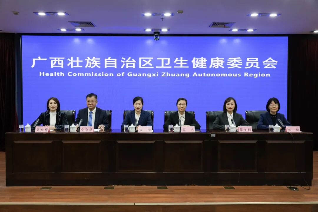 出席本次发布会的嘉宾有:自治区卫生健康委体制改革处处长朱坤女士,桂林市卫生健康委主任秦艳女士,梧州市卫生健康委党组书记、主任宁金沛先生,柳州市卫生健康委党组成员、副主任代文娟女士,玉林市卫生健康委党组成员、副主任杨媚女士,我是自治区卫生健康委宣传处处长覃素媛。