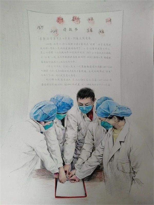 彩铅画《请战书》,作者唐文婷。