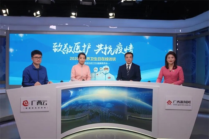 近日,自治区卫生健康委联合广西新闻网推出“致敬医护 共抗疫情”——2020年世界卫生日在线访谈节目,邀请自治区新冠肺炎防控指挥部疫情防控与医疗救治组副组长、自治区卫生健康委员会一级巡视员麦家志,广西护理队(方舱)领队张丽艳,江汉方舱医院分队医疗组组长韦球来到演播室,向广大网友讲述广西卫生健康系统医护人员抗击疫情的精彩故事,让大家进一步了解广西卫生健康系统的先进集体和个人的英勇事迹。