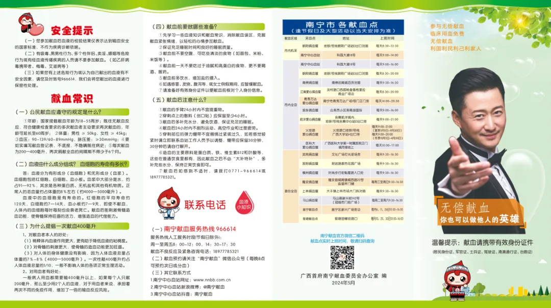 (五)联系人及联系方式:首府南宁献血委员会办公室陈海康,0771-3211720、15296574617;莫荣灿,0771-3217311、13878862034。