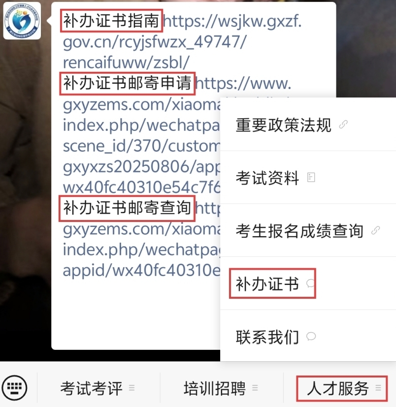 请关注“广西卫生健康人才与技术服务中心”微信公众号,进入发消息页面,根据需要依次点击“人才服务”→“补办证书”→“补办证书邮寄申请”,即可实现一体化服务。