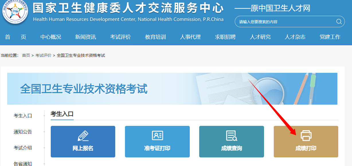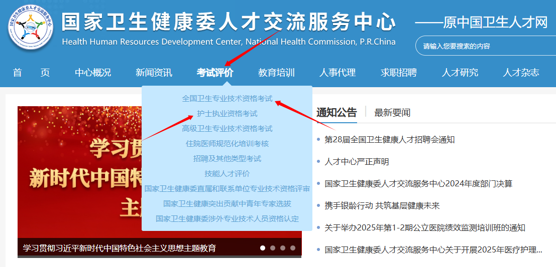 (一)登录国家卫生健康委人才交流服务中心网站(网址:www.21wecan.com),在“考试评价”下拉菜单中选择“ 全国卫生专业技术资格考试 ”或“护士执业资格考试”,如下图: