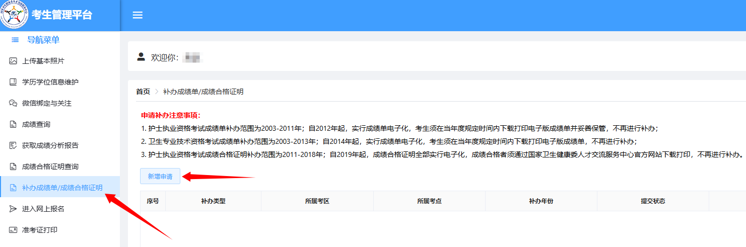 (四)点击“补办成绩单/成绩合格证明”>“新增申请”,如下图: