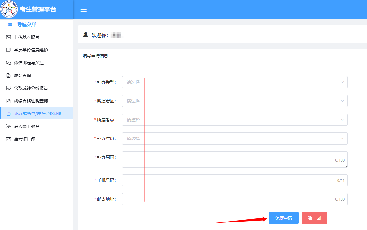 (五)申请信息填写完成后,点击“保存申请”,并根据页面提示上传材料,材料上传成功后,点击“提交申请”。