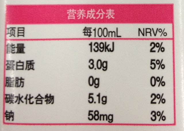 营养声称是指对食品营养特性的描述和声明,如能量水平、蛋白质含量水平,我们日常看到的“高钙”、“低脂”等都叫营养声称。下面一款脱脂奶,“脱脂”也是一种典型的含量声称,同时,这款产品中脂肪的含量非常低(接近于0)。营养声称可以帮助我们迅速的选择一些我们需要的产品。