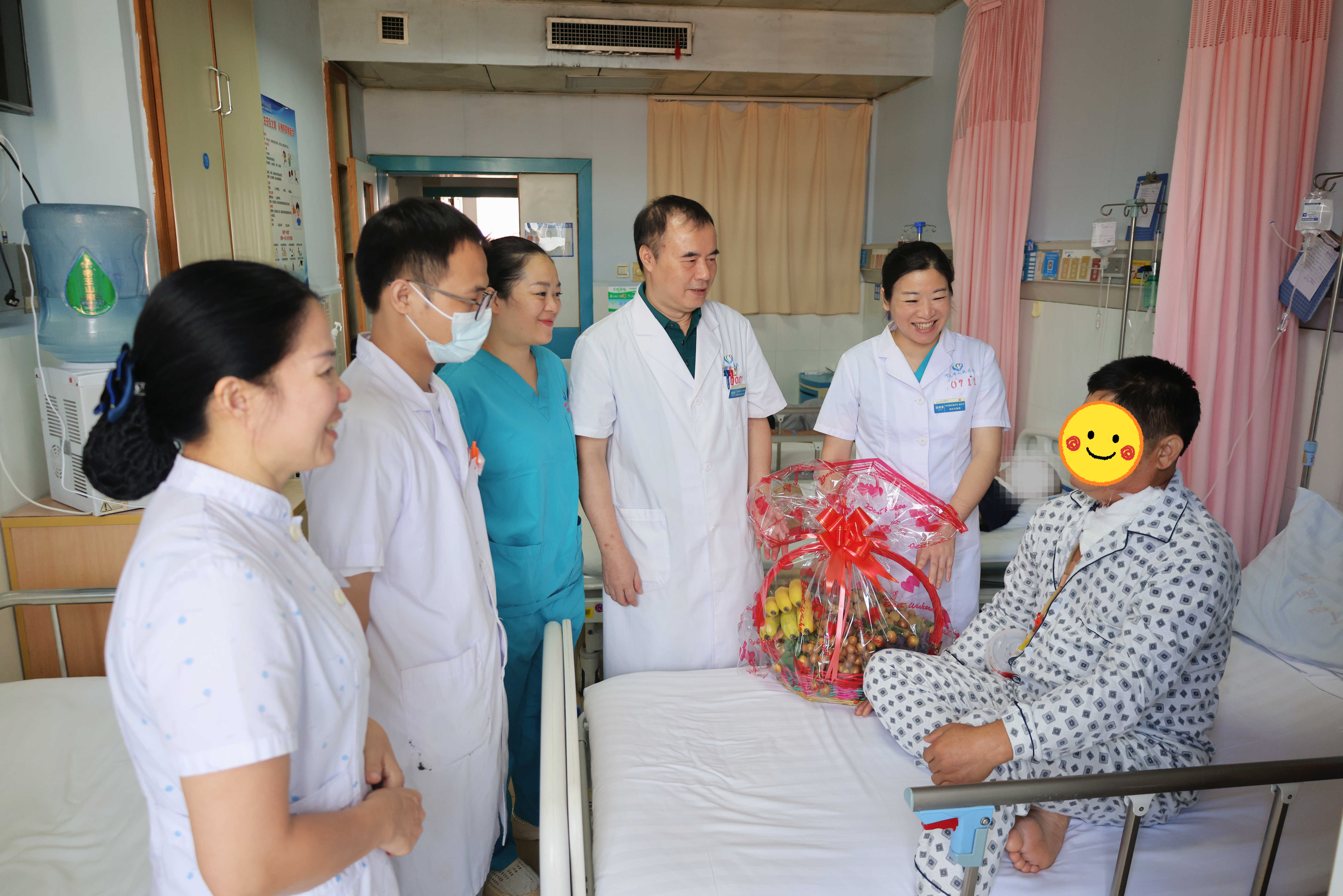 “卢大伯节日快乐!祝您早日康复。”当天,科主任徐阳春医师、覃洪斌医师带领医护人员来到退役老兵卢大伯病床前,详细询问了他的术后恢复情况。针对甲状腺疾病术后康复的注意事项,医护人员亲切叮嘱卢大伯和家属用药规范、饮食调理及复查要点,同时指导他颈部功能锻炼方法,并为他送上果篮、慰问卡及健康手册。