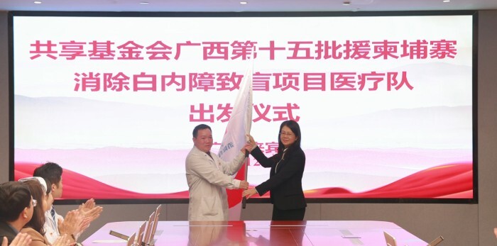 2025年12月30日,共享基金会广西第十五批援柬埔寨消除白内障致盲项目医疗队出发仪式在来宾市人民医院举行。自治区卫生健康委对外交流合作处处长梁慧婷,来宾市卫生健康委党组书记、主任邱鸿清,来宾市人民医院党委书记吴胜恩等领导出席活动,自治区卫生健康对外交流合作中心主任李玉芳主持会议。
