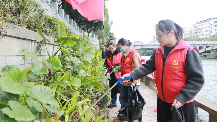 活动中,党员们手持垃圾夹、垃圾袋、扫帚等工具,沿着漓江步道对河岸绿化带、排水沟、观景平台等区域的塑料瓶、烟头、废弃杂物等各类生活垃圾进行“拉网式”清理,不放过任何一个卫生死角。初春的漓江两岸春意盎然,身着红色志愿服的党员志愿者们忙碌的身影,成为江畔一道靓丽的风景线。