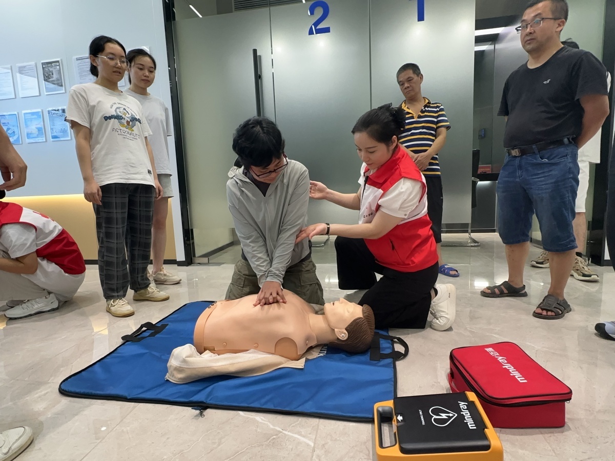 在培训中,培训师系统讲解了红十字会的起源与发展,详细阐述了各类应急救护场景的应对原则,并重点聚焦心肺复苏(CPR)与自动体外除颤器(AED)的操作流程及核心要领。在模拟实操环节,培训师通过生动的现场演示,对每位员工进行细致指导,确保急救动作规范精准。