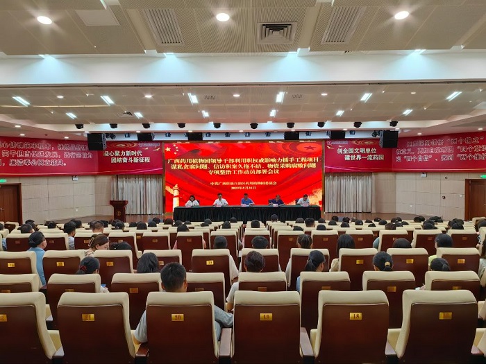 5月31日,广西药用植物园党委召开领导干部利用职权或影响力插手工程项目谋私贪腐问题、信访积案久拖不结、物资采购腐败问题专项整治工作动员部署会议,药园党委书记、主任张占江出席会议并作动员部署讲话,药园党委委员、纪委书记杨斌杰传达自治区卫生健康委专项整治工作会议精神,药园党委委员、党委办公室主任覃芳主持会议。