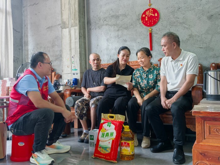 随后,慰问组一行深入帮扶对象家中开展走访慰问,梁宇晖、黄定贵代表全体人员耐心询问了帮扶对象的生产生活情况以及存在困难,送去了中秋慰问品和节日祝福,来自南溪山医院的医护人员现场为他及家人检查身体状况,并针对病情为他们准备了后期治疗的药品。