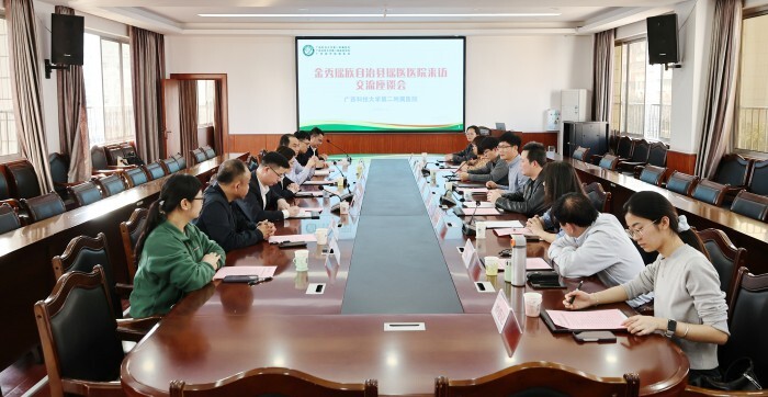近日,金秀瑶族自治县瑶医医院党委书记梁祖兴、院长李发安一行到广西科技大学第二附属医院交流座谈。医院党委书记覃莲,党委副书记、院长张施明,副院长谢正德及相关科室负责人参与交流座谈。