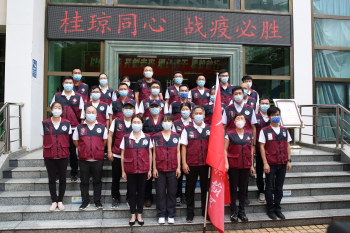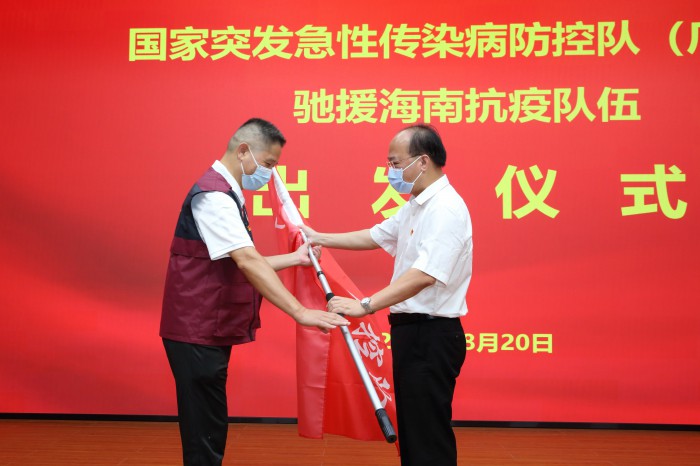 自治区疫情防控指挥部疫情防控与医疗救治组组长、自治区卫生健康委党组书记、主任廖品琥向国家突发急性传染病防控队(广西)驰援海南疾控队授旗。