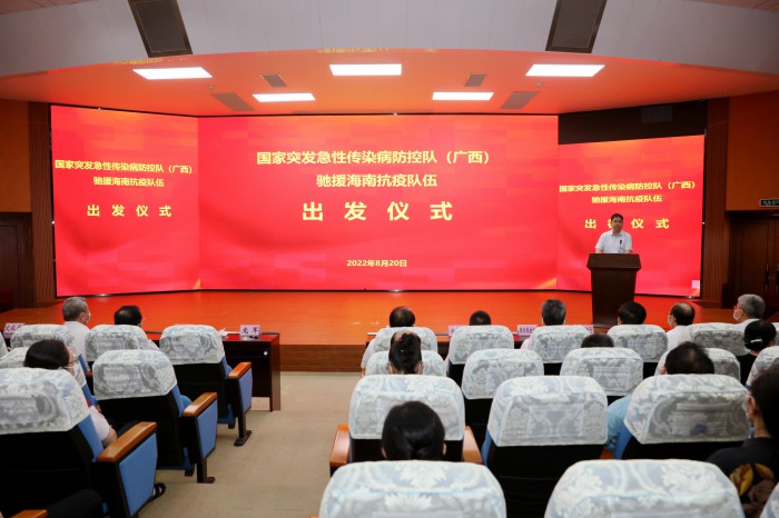 出发仪式上,自治区疫情防控指挥部疫情防控与医疗救治组组长、自治区卫生健康委党组书记、主任廖品琥向国家突发急性传染病防控队(广西)驰援海南抗疫队授旗,并宣布队伍出发。仪式由自治区疫情防控指挥部疫情防控与医疗救治组副组长、自治区卫生健康委党组成员、副主任庞军主持。