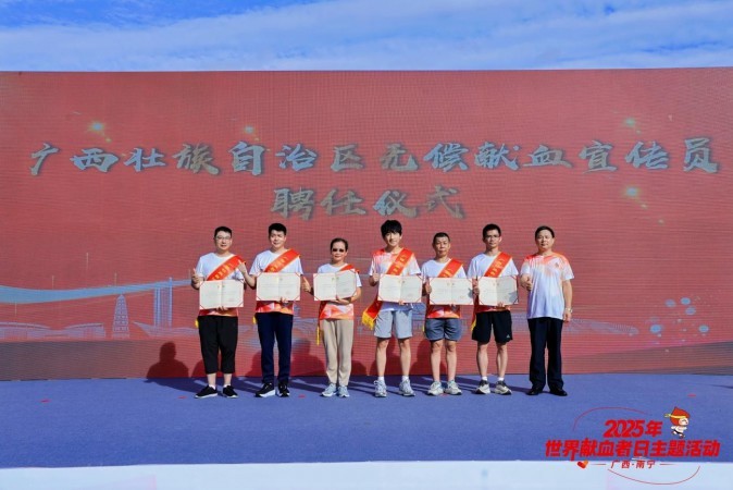 6月14日,2025年世界献血者日公益热血跑主题活动暨自治区无偿献血宣传员聘任仪式在南宁市南湖公园举行。南宁市副市长徐科峰发表开幕致辞,自治区卫生健康委党组成员、副主任黎君君讲话。