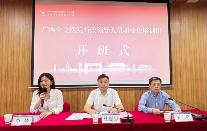 6月8日至13日,自治区卫生健康委2025年广西公立医院行政领导人员职业化培训班在浙江大学举办。自治区卫生健康委党组书记、主任杜振宗同志出席开班仪式并讲话。