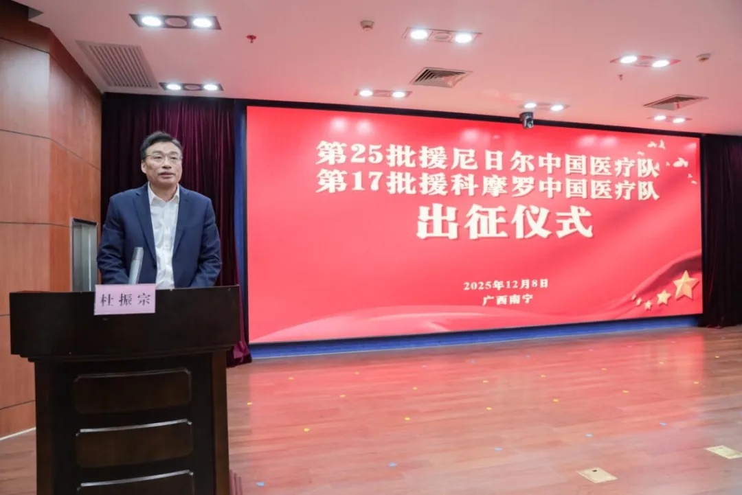 杜振宗指出,2026年是“十五五”开局之年,也是广西承派援外医疗队50周年,第25批援尼日尔、第17批援科摩罗中国医疗队于此刻出征,责任重大、使命光荣。他强调,医疗队员要提高政治站位,增强做好援外医疗工作的责任感、使命感,继承和发扬广西援外医疗工作的优良传统,严格遵守各项纪律和规章制度,推进2024年中非合作论坛北京峰会成果落实,以优质医疗卫生服务促进中非卫生健康合作持续深化。各派员单位和后盾单位要做好关心关爱,切实解决医疗队员的后顾之忧。