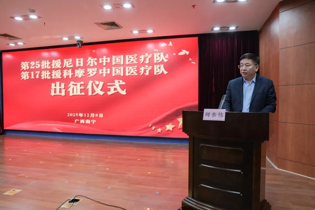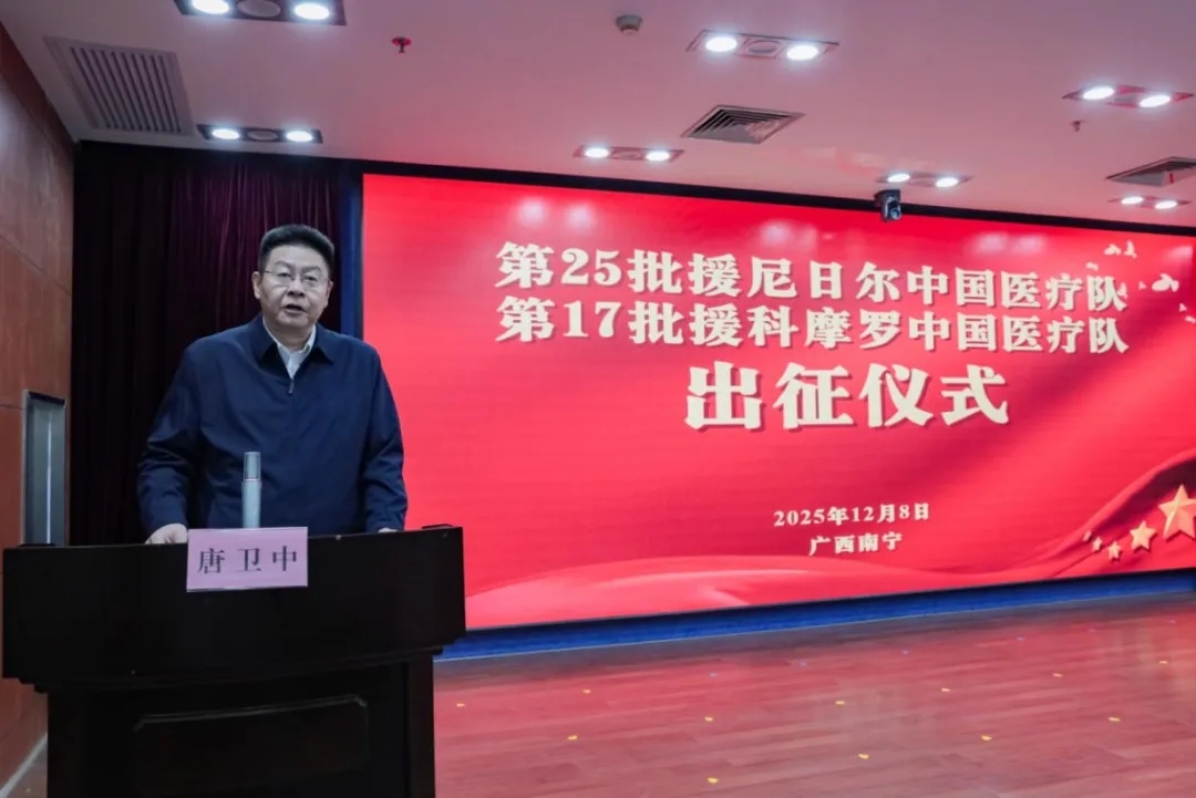 12月8日,由广西选派的第25批援尼日尔、第17批援科摩罗中国医疗队出征仪式在南宁举行。自治区卫生健康委党组书记、主任杜振宗,广西医科大学党委常委、副校长唐卫中,国家卫生健康委国际合作司非洲(援外)处赵清如出席仪式并讲话。自治区卫生健康委党组成员、副主任周恭伟主持。