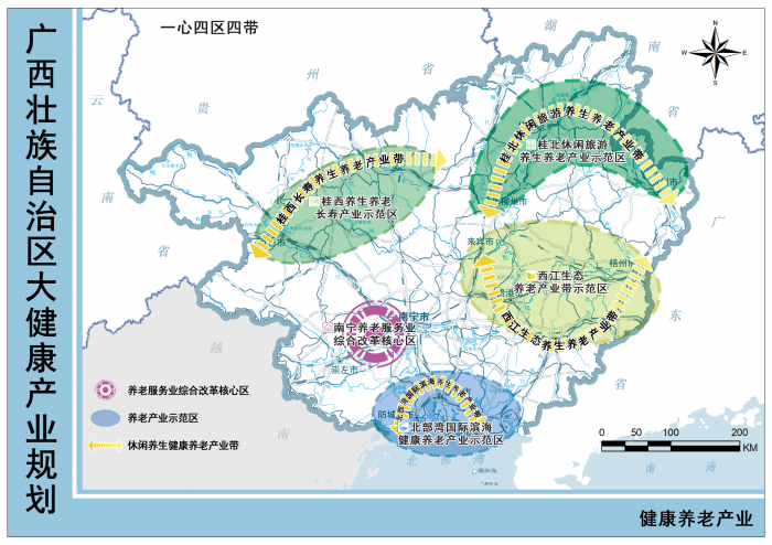 “一心四区四带”:“一心”指南宁养老服务业综合改革核心区;“四区”指桂西养生养老长寿产业示范区、桂北休闲旅游养生养老产业示范区、北部湾国际滨海健康养老产业示范区、西江生态养老产业带示范区;“四带”指桂西长寿养生养老产业带、北部湾国际滨海养生养老产业带、西江生态养生养老产业带和桂北休闲旅游养生养老产业带。
