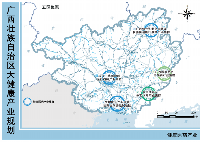 五大集聚区:南宁(现代中药和诊断医疗器械产业集群)、桂林(广西特色创新化学药及检验检测医疗器械产业集群)、梧州(广西岭南特色民族药产业集群)、玉林(广西中成药及中药饮片产业集群)、北钦防(生物医药产业群和国际医学开放试验区)。