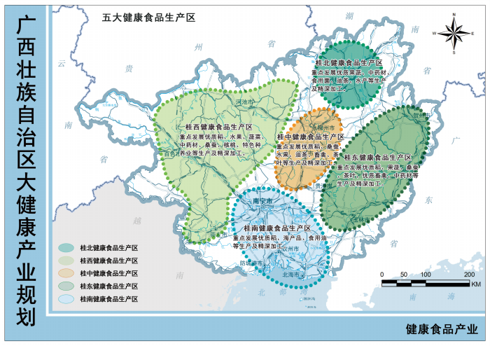 “五大健康食品生产区”:桂北健康食品生产区重点发展优质果蔬、中药材、食用菌、油茶、水产等生产及精深加工;桂东健康食品生产区重点发展优质稻、果蔬、桑蚕、茶叶、优质畜禽、中药材等生产及精深加工;桂中健康食品生产区重点发展优质稻、桑蚕、水果、油茶、畜禽、茶叶等生产及精深加工;桂西健康食品生产区重点发展优质稻、水果、蔬菜、中药材、桑蚕、核桃、特色种养业等生产及精深加工;桂南健康食品生产区重点发展优质稻、海产品、食用油等生产及精深加工。