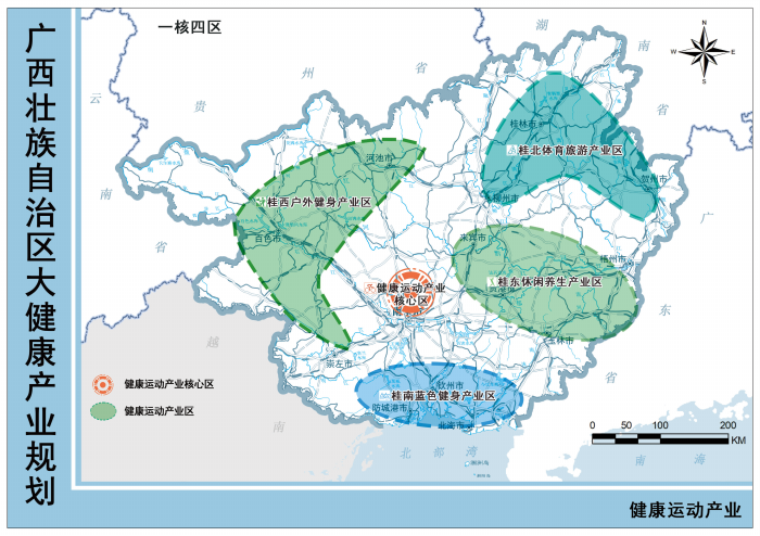 “一核四区”:“一核”指南宁健康运动产业核心区;“四区”指桂东休闲养生产业区、桂南蓝色健身产业区、桂西户外健身产业区、桂北体育旅游产业区。