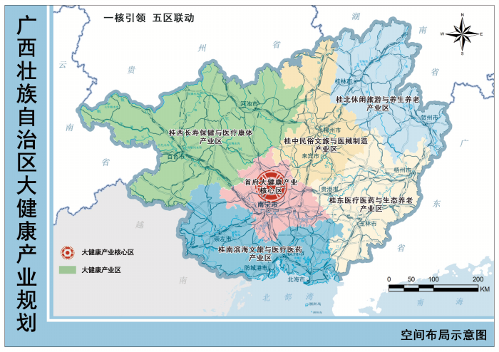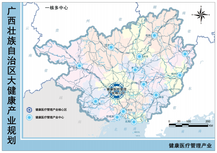 “一核多中心”:南宁——健康管理产业核心区;多中心:柳州市、桂林市、梧州市、北海市、防城港市、钦州市、贵港市、玉林市、百色市、贺州市、河池市、来宾市、崇左市。
