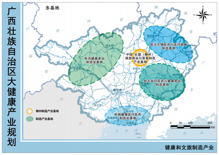 “多基地”:中国—东盟(柳州)旅游商品与装备制造产业基地、桂西健康食品制造业基地、桂南健康医疗医药制造业基地、桂北生物医药与医疗器械制造基地、桂东医疗医药与健康食品制造基地。