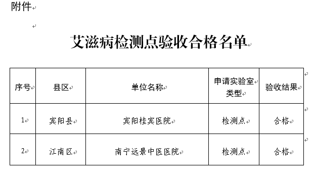 (南卫报〔2024〕64号)收悉。根据《全国艾滋病检测工作管理办法》相关规定,经研究,同意宾阳桂宾医院等2家艾滋病检测点资格认定验收合格。请严格按照有关工作规定和工作规范,认真做好艾滋病检测工作,确保检测质量。