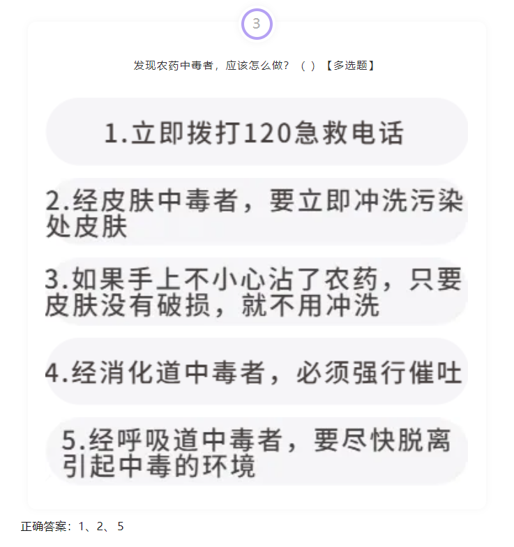 施用农药时,要严格按照说明书进行操作,做好个人防护。严禁对收获期的粮食、蔬菜、水果施用农药。严防农药污染水源。发现农药中毒者,应立即拨打120急救电话呼救。经消化道中毒者,如果中毒者清醒,不建议常规催吐。经皮肤中毒者,要立即冲洗污染处皮肤。经呼吸道中毒者,要尽快脱离引起中毒的环境。