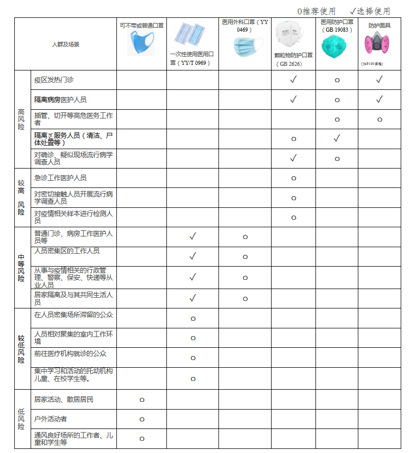 在新型冠状病毒感染的肺炎流行期间,建议选择合适的口罩类型,不过度防护。按防疫工作性质和风险等级提出以下指引: