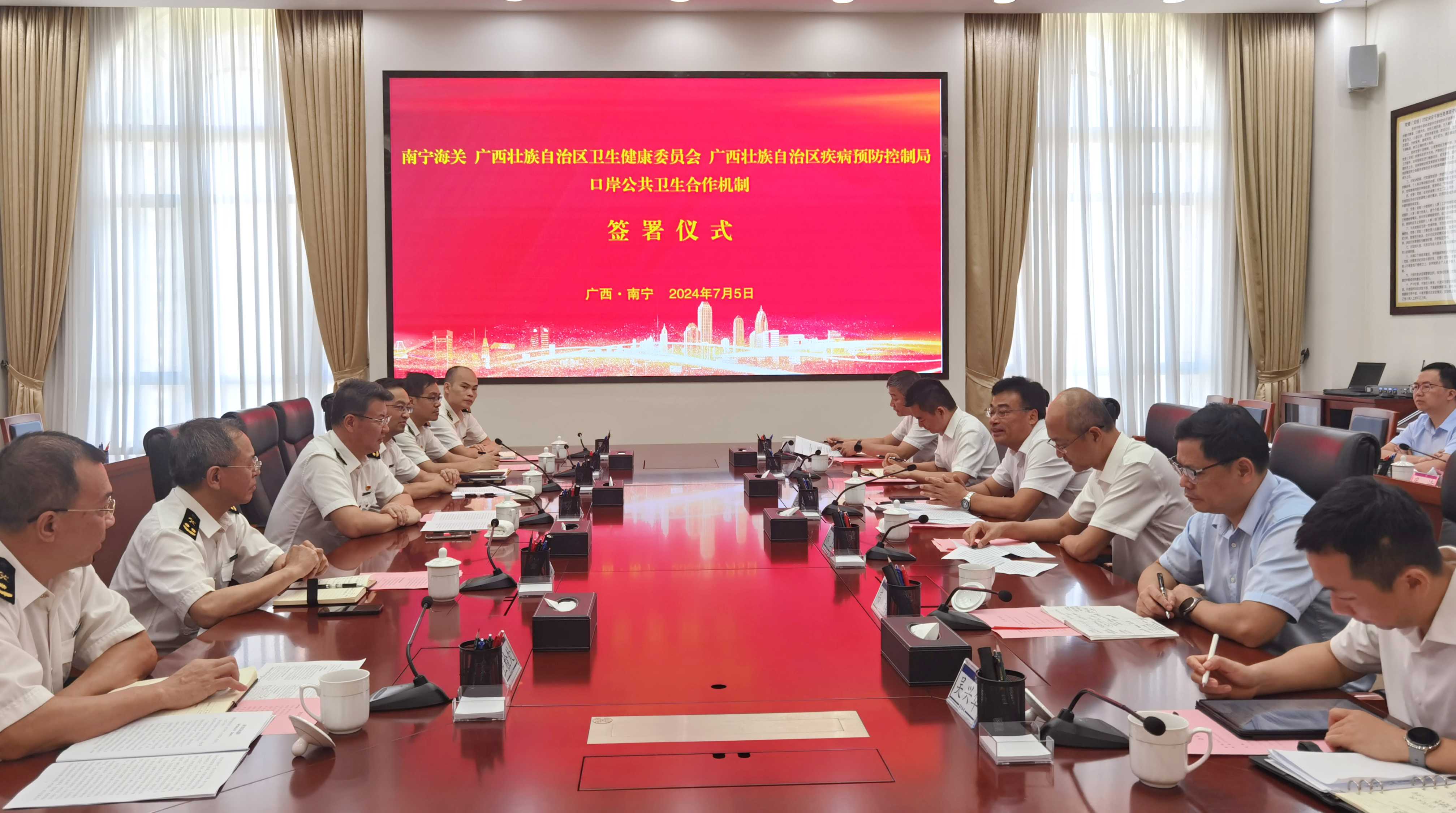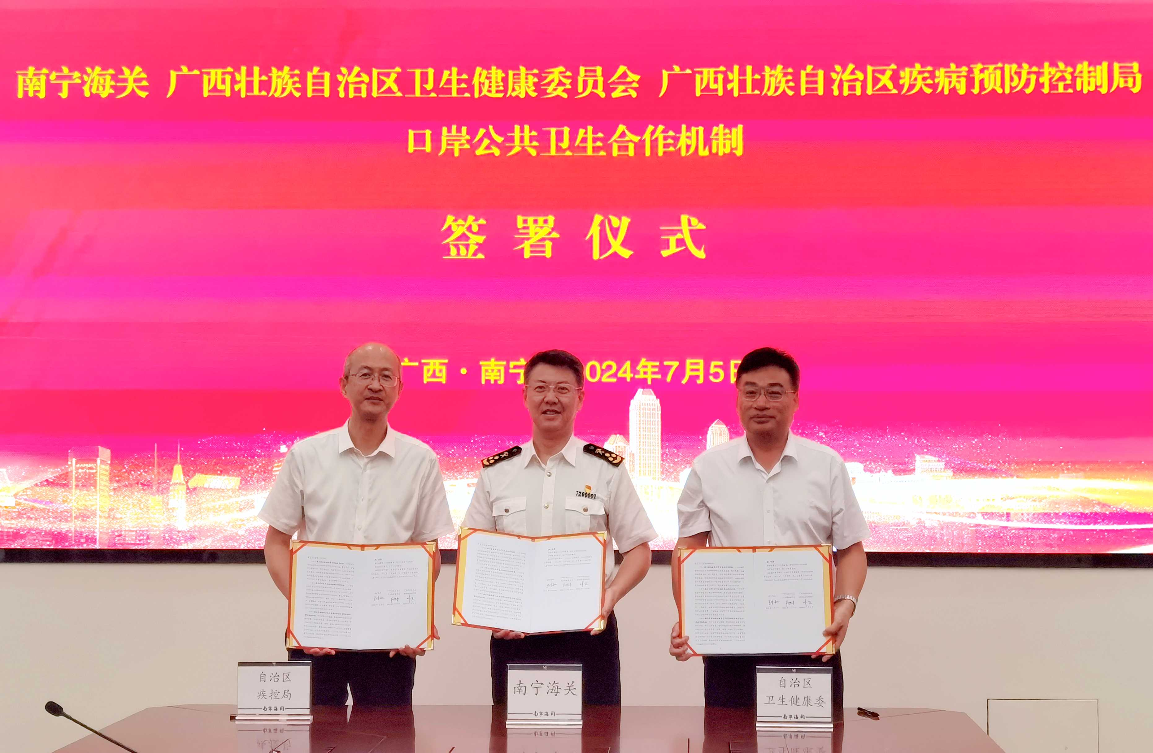 7月5日,自治区卫生健康委党组书记、主任杜振宗,自治区卫生健康委党组成员、副主任,自治区疾控局党组书记、局长林卫和南宁海关党委书记、关长王味冰在南宁签署口岸公共卫生合作机制文件。