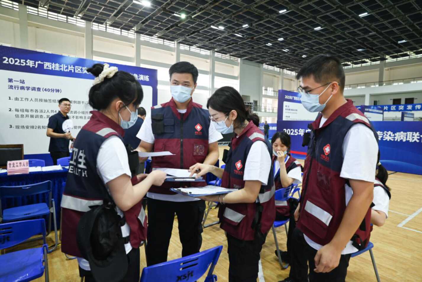 本次演练汇聚了来自桂林、柳州、来宾、河池四市的4支卫生应急队伍共40名专业队员,展开了一场紧张激烈的实战竞技。演练采用“实战推演+攻防对抗”双模并行机制,以伤寒疫情、人感染高致病禽流感疫情双场景为切入点,四市队伍在有限时间内,协同高效完成多源信息整合、流行病学调查溯源、样本采集、实验室结果分析以及疫点消毒等重要任务,全面检验了应急队伍在规范化处置方面的实践能力以及跨市协作的效率,攻防对抗环节通过跨组质询流行病学报告和防控策略,进一步考察了应急队伍在信息不足时的现场判断能力、应急决策水平以及策略调整速度。演练结束后,自治区疾控中心、桂林医科大学公共卫生学院的专家组对演练的各环节进行全面评估,并提出精准的指导意见,助力后续优化。