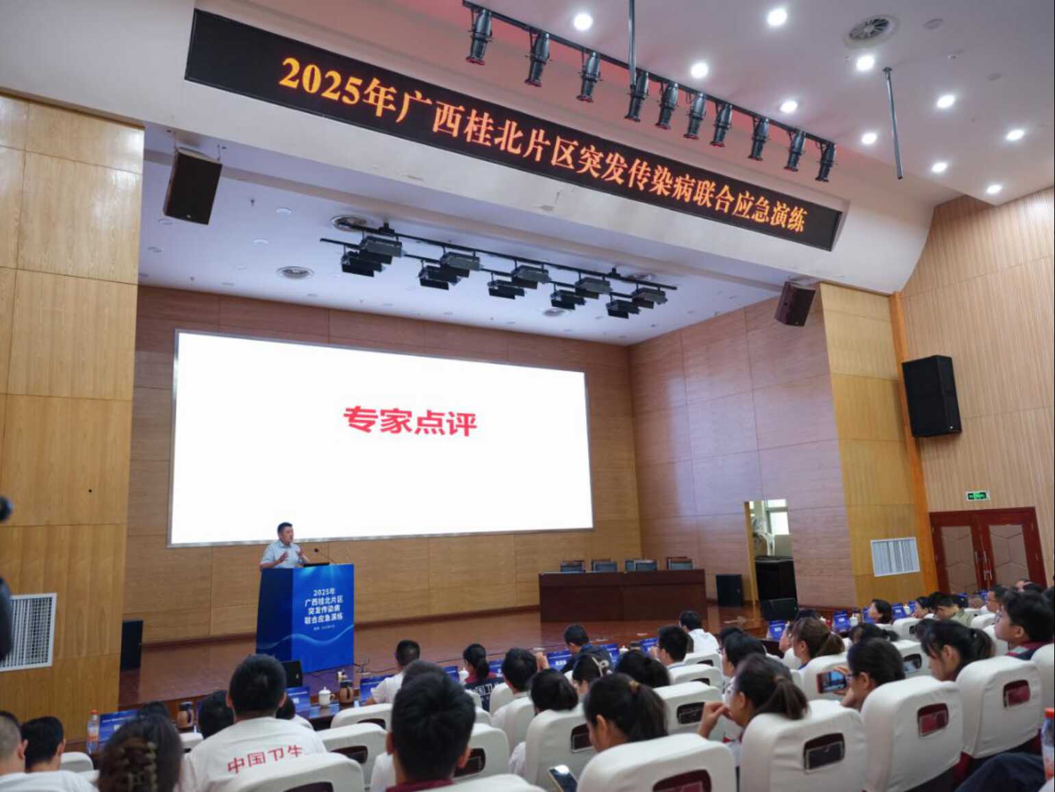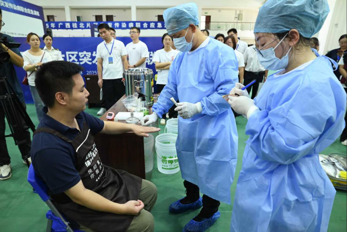 自治区疾控局有关处室负责同志,湖南省疾控局相关处室负责同志,柳州、来宾、河池三市疾控局主要负责同志,自治区疾控中心相关同志,自治区胸科医院、自治区皮肤病医院(皮肤病防治研究所 亭凉医院)等区直医疗机构应急队伍骨干,各县(市、区)疾控系统骨干人员,桂林医科大学公共卫生学院学者以及相关单位代表等160余人观摩了本次演练。
