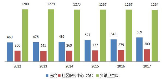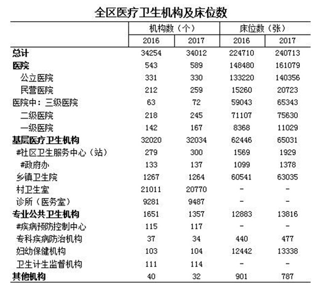 (一)医疗卫生机构总数量。2017年,全区卫生和计划生育机构数达34012个(含村卫生室),医院589个(其中,公立医院330个,民营医院259个;医院按等级分:三级医院72个(其中:三级甲等医院45个),二级医院245个,一级医院167个,未定级医院105个);基层医疗卫生机构32034个(其中,乡镇卫生院1264个、社区卫生服务中心159个、社区卫生服务站141个、门诊部和诊所.卫生所9700个、村卫生室20770个);专业公共卫生机构357个(其中,疾病预防控制中心 117个、专科疾病防治院/所/站34个、健康教育所1个、妇幼保健院/所/站104个、急救中心4个、采供血机构29个、卫生监督所114个、计划生育技术服务机构954个);其他卫生机构32个。