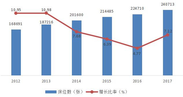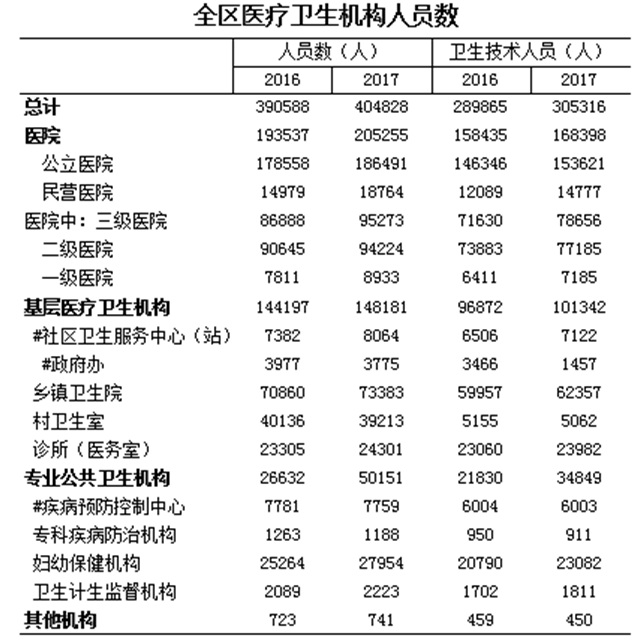 (二)医疗卫生机构床位数持续增加。2017年底,全区医疗卫生机构床位数240713张,比上年增加了16003张,增长了7.12%。每千人口医疗卫生机构床位数由2016年的4.64张提高到2017年的4.93张(按2017年常住人口数计算,下同),增长了6.25%;医院床位数161079张,比上年增加12599张,增长了8.49%。其中,中医类医院床位数30576张,比上年增加628张,增长了2.10%。民营医院床位数20723张,比上年增加5463张,增长了35.80%;乡镇卫生院床位数63035张,比上年增加2494张,增长了4.12%。