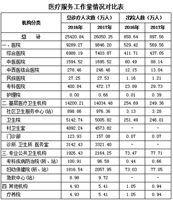 2017年,全区医疗卫生机构总诊疗人次数2.61亿人次,比上年增加629.51万人次,增长了2.48%。其中,医院总诊疗人次数9846.20万人次,比上年增加556.93万人次,增长了6.00%。基层医疗卫生机构总诊疗人次数1.40亿人次。乡镇卫生院总诊疗人次数5005.82万人次,比上年减少136.92万人次,下降2.66%。