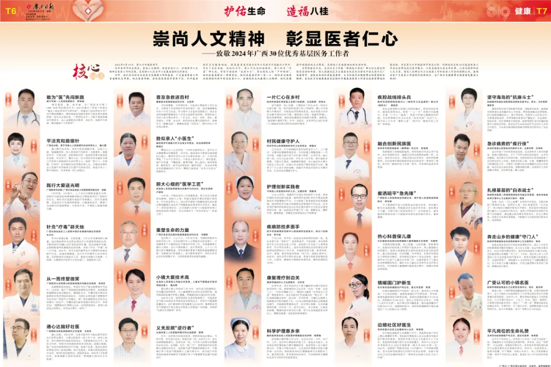 在第七个中国医师节到来之际,本报记者走进基层、来到这些优秀的医者身边,以他们的视角记录生命故事,以身边的榜样传递人文力量,增进人民群众对卫生健康工作和医务工作者的理解认同,激励全区广大医务工作者践行使命担当,为广西卫生健康事业高质量发展再立新功!