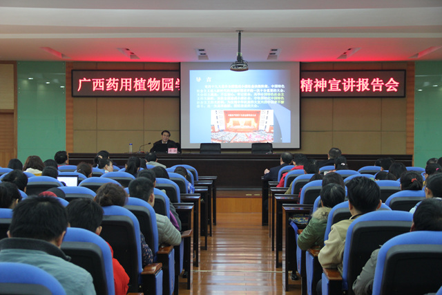 为深入学习贯彻党的十九大精神,推动十九大精神进一步深入人心,1月16日,广西药用植物园(以下简称“药园”)组织召开了学习贯彻党的十九大精神宣讲报告会。自治区宣讲团成员,区政协文史和学习委副主任委员、编审黄健教授作宣讲报告,药园全体干部职工聆听了报告,药园党委书记梁景旭主持报告会。