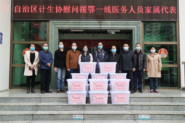新冠肺炎疫情发生以来,我区多次派出医疗队驰援湖北。为贯彻落实中央、自治区关心爱护参与疫情防控工作医务人员的决策部署,表达对抗疫一线医务人员及其家属的敬爱之情,让奔赴湖北的“最美逆行者”放心、暖心、安心,自治区计生协于3月5日由部室负责人带队分组对自治区人民医院、妇幼保健院、江滨医院、工人医院、疾病预防控制中心5家单位85名援湖北医务人员及其家属代表开展慰问活动,每人赠送米、油、营养品等价值500元的生活物品慰问包。