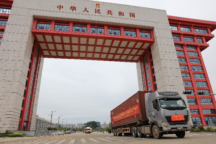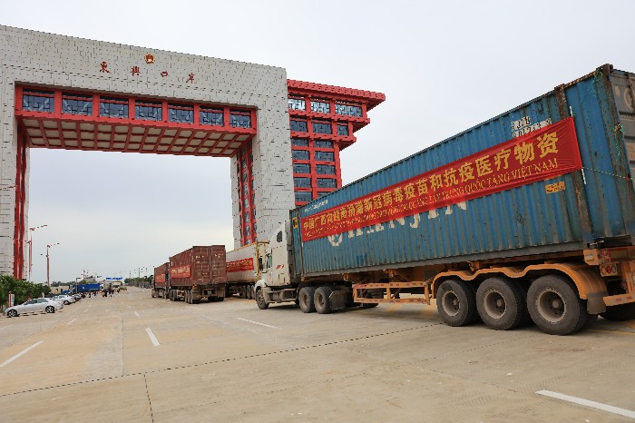 10月22日,广西捐赠越南的新冠病毒疫苗和抗疫医疗物资运抵东兴口岸,越南运输车辆入境进行物资交接,捐赠工作圆满完成。