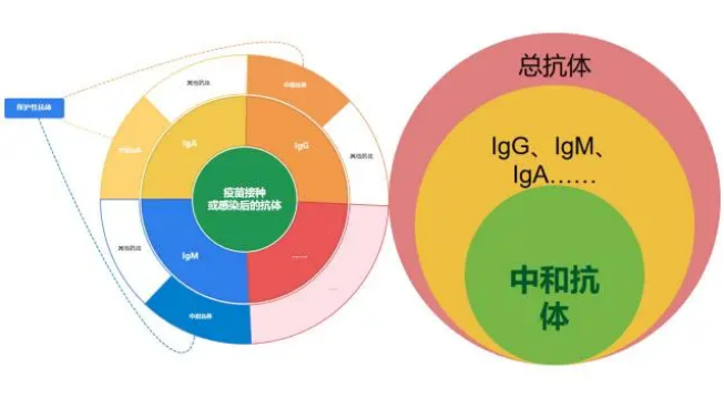 总抗体、IgM和IgG等与中和抗体的关系(如图):中和抗体可能是IgG、IgM、IgA等,但不是所有的IgG、IgM、IgA都是中和抗体,试剂盒检测到的IgG、IgM、IgA等结果不能等同于中和抗体的结果。