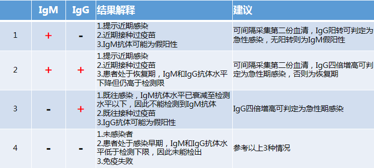 在发病后(或首次核酸检测阳性后)1周内就可以检测到,第2周抗体水平上升达到或接近峰值状态,第3或第4周抗体水平开始下降,第4~5周后抗体阳性率开始明显下降。IgM抗体升高可提示近期或急性感染,可作为早期感染的指标。