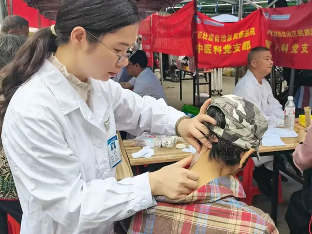 义诊现场还设置了“中医特色区”,吸引了众多群众参与体验。中医科护士长覃华为病人贴穴位敷贴,利用中医特色疗法为病人调理身体;中医科主管护师韦丽华运用扶阳罐为病人治疗,通过温通经络达到舒经活络的效果……医护人员用专业与热情,为基层群众的健康保驾护航。