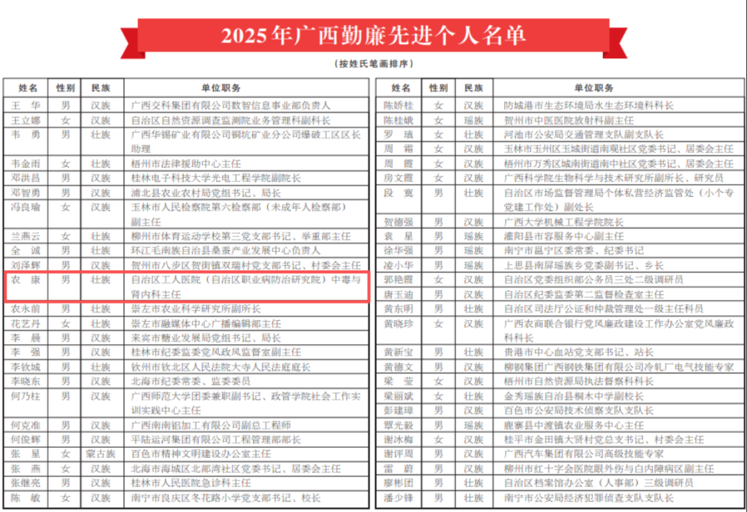 近日,自治区纪委机关、自治区党委组织部、自治区党委宣传部联合公布第五届广西勤廉先进个人评选结果。广西工人医院(广西职业病防治研究院)中毒与肾内科主任农康凭借“勤廉兼优”的突出表现光荣入选,成为卫健系统践行勤廉精神的典范。