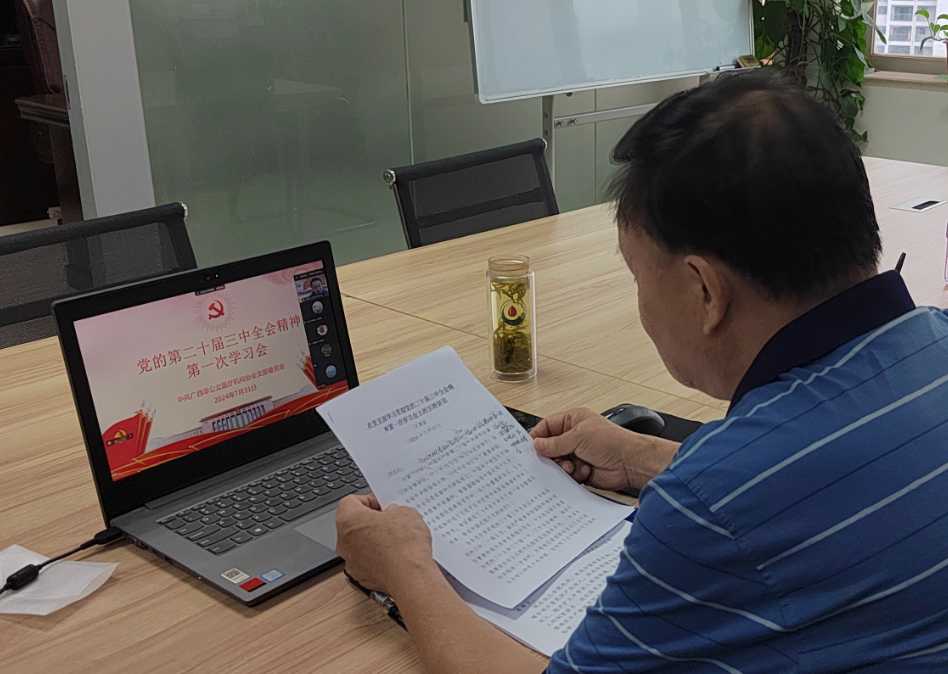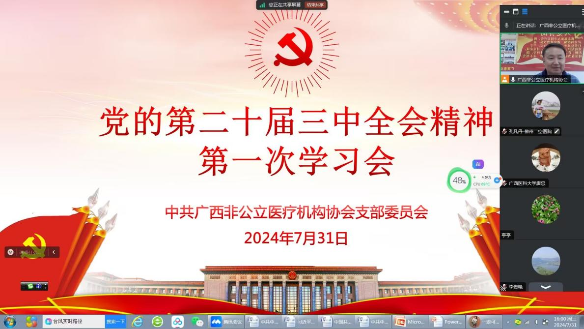 中国共产党第二十届中央委员会第三次全体会议于7月15日至18日在北京举行。为学习贯彻会议精神,中共广西非公立医疗机构协会支部委员会于7月31日在线上开展党的二十届三中全会精神第一次集中学习。协会党支部全体党员和秘书处成员参加了学习,学习会由党支部书记王建政主持。